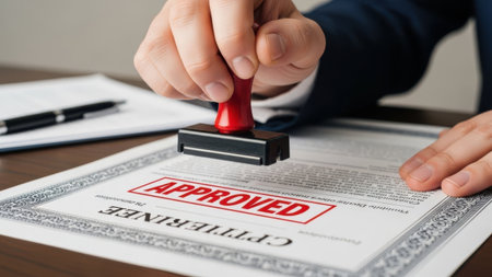 A close-up shot captures a person's hand holding a red rubber stamp, pressing it down onto a white official document or certificate. The word APPROVED in red ink is visible on the paper, signifying successful validation or authorization. The scene takes place on a wooden desk, with another hand holding the document and a pen in the background, suggesting an office or administrative setting where official paperwork is processed and finalized.