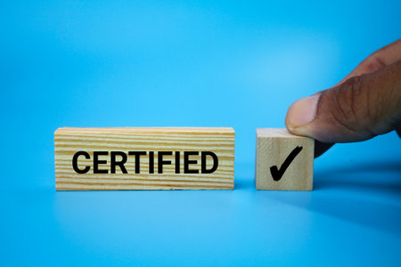 cubes and wooden boards with the word certified and correct sign. Certification of standards, right choice, production standard, and good quality.