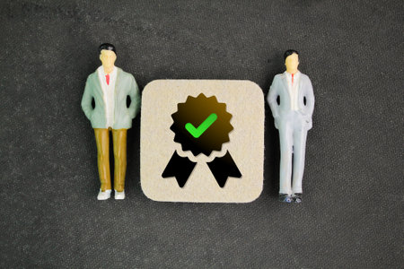 two miniature people with the Certified symbol or icon. best quality assurance. Quality warranty concept. Standardization certification. Compliance to service regulations and stand