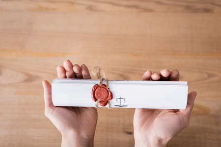 top view of cropped lawyer holding rolled contract with wax seal