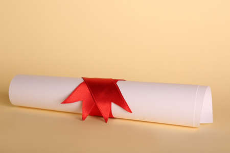 Rolled student's diploma with red ribbon on beige background