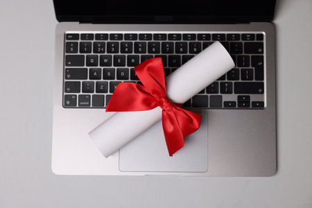Diploma and laptop on light table, top view