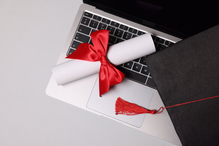 Graduation cap, laptop and diploma on light table, flat lay