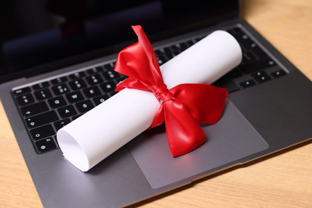 Diploma and laptop on wooden table, closeup