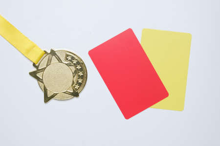 A picture of gold medal with red and yellow card. Sports disqualification concept.