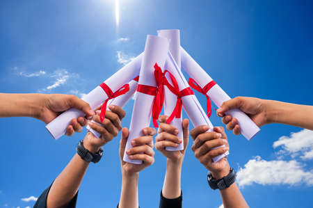 Cropped image of successful graduates in academic dresses holding diplomas while standing outdoors