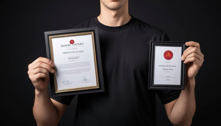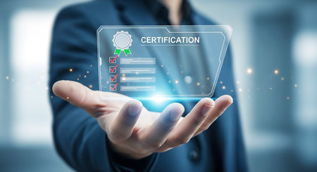 A hand holds a glowing transparent digital screen displaying a certification document with a checklist and an award badge.