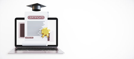 Digital certificate with a golden seal and graduation cap displayed on a laptop screen, on a white background. Concept of online education. 3D Rendering