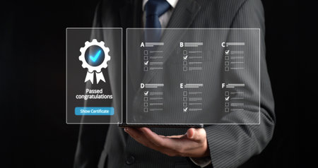 Business person secures product certification, marking a key achievement. Demonstrates commitment to quality and trustworthiness by having product certification passed.