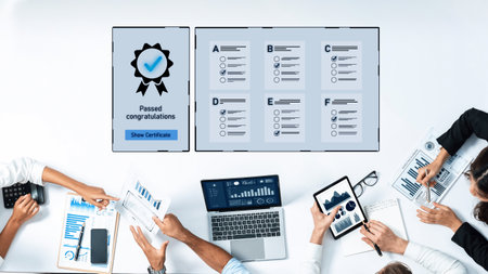 A team celebrates a project success in a modern office, showcasing certificates and performance charts while collaborating on future strategies and goals.