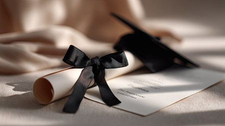 A close-up of a graduation cap and diploma with a black ribbon, set against a soft, neutral-toned background to highlight the momentous occasion