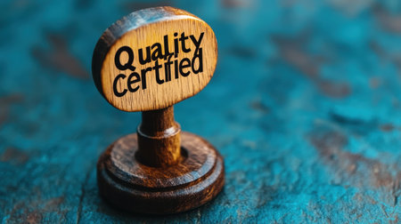 A quality certified seal with rich text on a wooden base rests against a textured background, symbolizing trust and standards in business and assurance.
