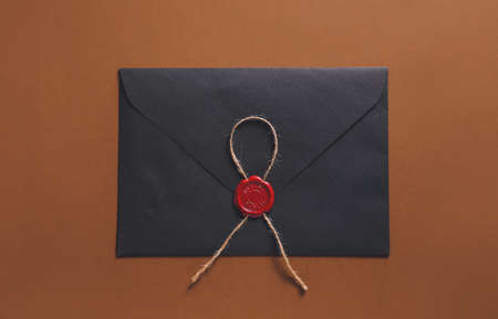 Envelope with notary public wax seal on color background