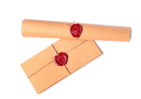 Envelope and scroll with wax seal stamps of notary public on white background