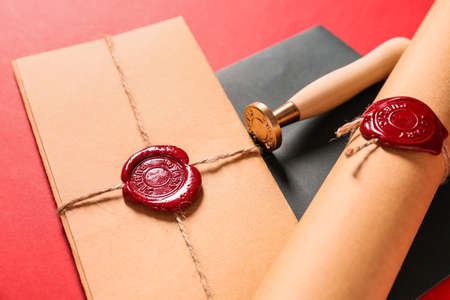 Envelopes and scroll with wax seal stamp of notary public on color background