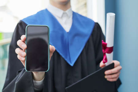 Close up of unrecognizable college graduate holding smartphone with blank screen to camera during ceremony, copy space
