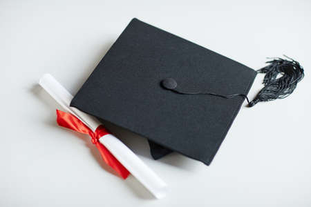 Close up of graduation cap and diploma with red ribbon on white background