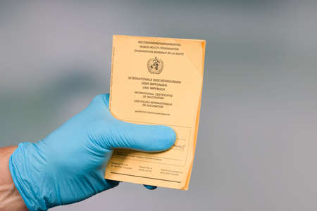 doctor's hand with a well used document of international certificates of vaccination
