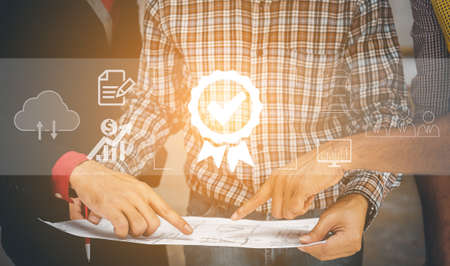 Business People working with sign of the top service Quality assurance, Guarantee, Standards, ISO certification and standardization concept. Start up business, Quality assurance of business services