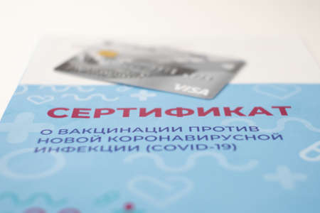 Krasnodar, Krasnodar Territory, Russia, Jule 5, 2021: Close-up of the vaccination certificate and Visa bank card. Sale of fake forms by scammers. Selective focus