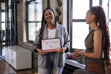 African American woman holding certificate, smiling with colleague in modern office. Business, achievement, diversity, teamwork, success, professional