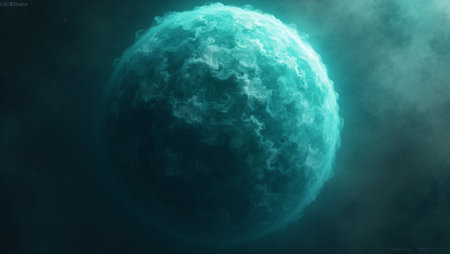 Vibrant teal gas giant with swirling clouds and dark blue storms