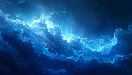 Fluid Art. Fluorescent blue waves with golden particles on black background. Marble effect background or texture