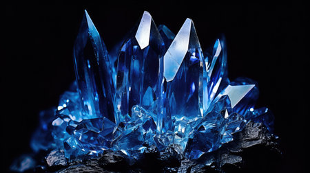 Close-up of blue quartz crystals on a black background