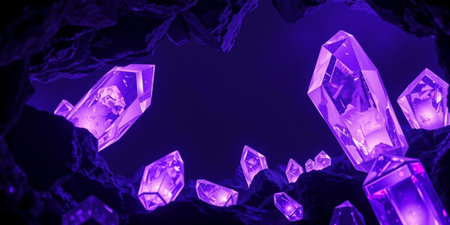 Explore a captivating view of glowing amethyst crystals nestled within a dark cavern, radiating vibrant purple light and serenity.