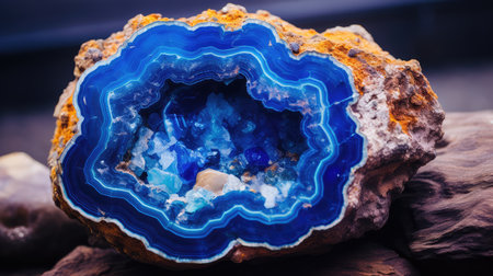 A captivating close-up view of a striking geode showcases its vibrant colors and intricate crystal formations, revealing nature's stunning mineral beauty. Perfect for geological themes.