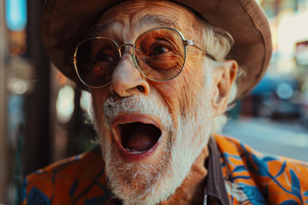 Closeup of a charismatic elderly man wearing a hat and round sunglasses, with a surprised expression