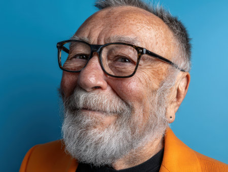Elderly man with a white beard and glasses smiling slightly, wearing an orange jacket and black shirt. His expression is warm and friendly, suggesting wisdom and positivity