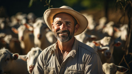 shepard man portrait with many sheep in the background looking