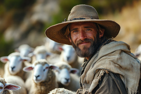 Shepherd wearing a distinctive wide-brimmed hat, watching over or guiding a herd of sheep in a meadow or field.