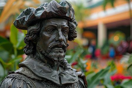 Bronze Statue of Historical Figure Surrounded by Lush Greenery in Urban Landscaping