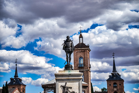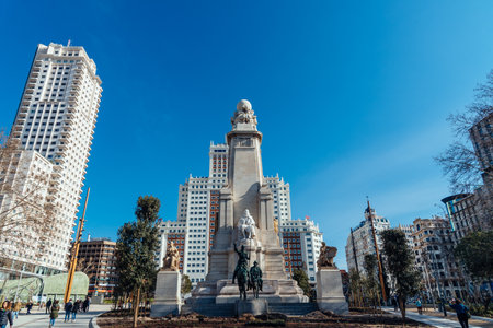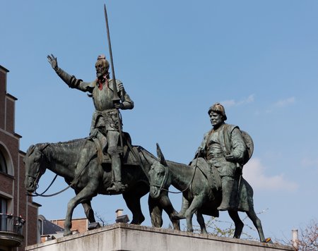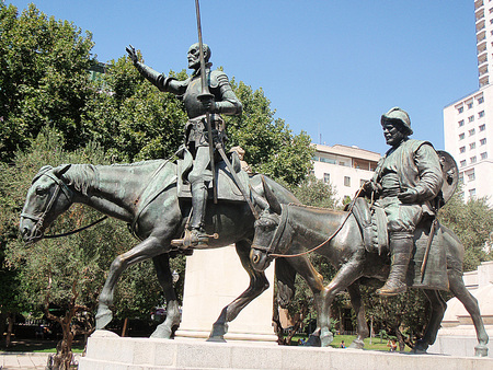 Don Quixote and Sancho Panza monument on Spain square in Madrid, Spain