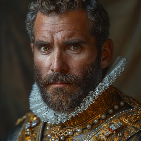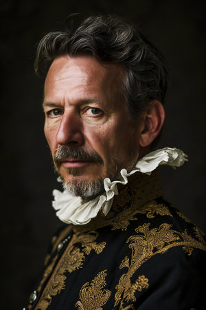 Thoughtful man with beard wearing historical costume