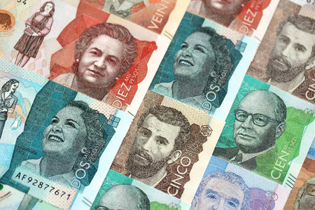 Colombian pesos money bills banknotes lies in big pile on table close up. Concept of finances and business in Colombia