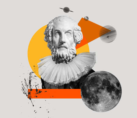Contemporary art collage. Idea, inspiration, aspiration and creativity. Model with ancient statue head in vintage clothing. Concept of comparison of eras, artwork.
