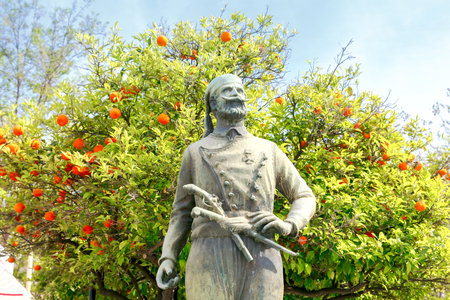 Spain, Madrid - March 6th, 2021: Miguel de Cervantes Saavedra statue. National Library of Spain entrance, Madrid. Sculpted by Joan Vancell Puigcercos in 1892
