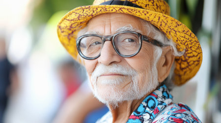 Elderly man with a white beard wearing glasses, a colorful shirt and a yellow hat is smiling