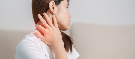 Asian woman using hand touch her nape with feeling stress and pain caused by bad ergonomic and long hour working.