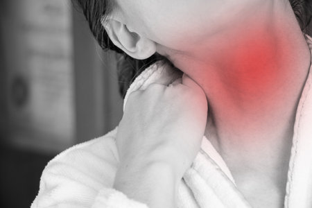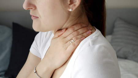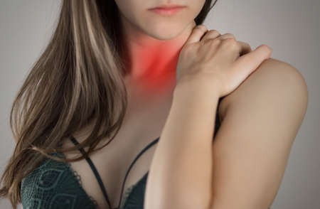 Closeup of young woman massaging her neck feeling pain. Concept of healthcare problems, pain relief and injuries