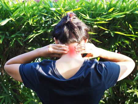Young Asian woman and illness, Body aches with neck pain, shoulder and back pain or use hand to massage on occipital to relieve the headache.