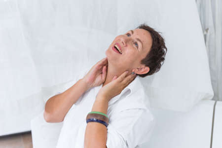 The doctor holds the results of an ultrasound examination of the throat against the background of a female patient who has a pain and a lump in her throat. Neurological and Thyroid Disease Concept
