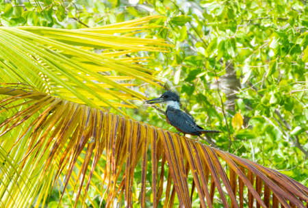 A Ringed Kingfisher, Megaceryle torquata perching in a palm tree with bright sunlight shining through trees in the background.Description