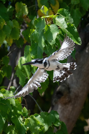 A male Pied Kingfisher Ceryle rudis hovering in flight