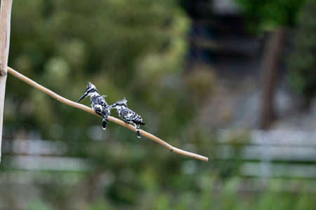 pied kingfisher (Ceryle rudis) happy black and white bird is about to flying from thin bamboo branch over blur green background in nature, exotic animal