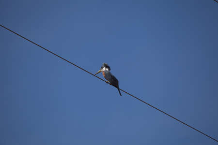 Closeup of colorful Ringed Kingfisher (Megaceryle torquata) sitting on wire Transpantaneira, Pantanal, Brazil.