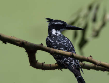 Pied kingfisher (Ceryle rudis) sitting on a branch and looking around. Pied kingfisher on the hunt. Green background.